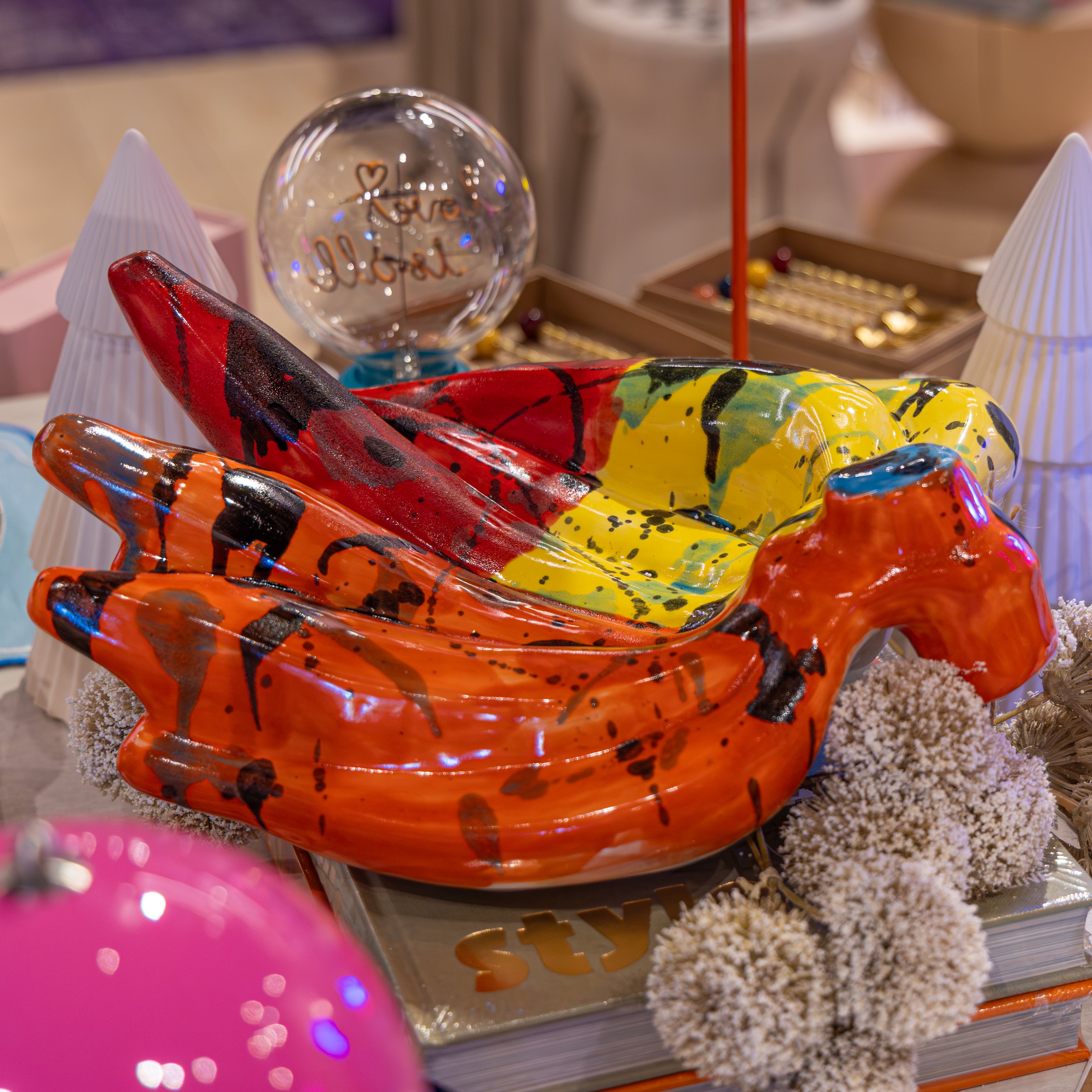 The Plátanos by BeMe are ceramic pieces that beautifully capture the essence of the iconic fruit, with their base made from high-quality ceramic material. The unique feature of these pieces lies in their vibrant, multicolored bases, which are thoughtfully mixed with various shades. This colorful blend gives each piece a distinct and lively character, making it a true work of art. The ceramic craftsmanship ensures durability, while the rich colors bring energy and warmth, creating a striking visual display. Each Plátano piece by BeMe is a fusion of artistry and playfulness, perfect for adding a pop of color and style to any space.