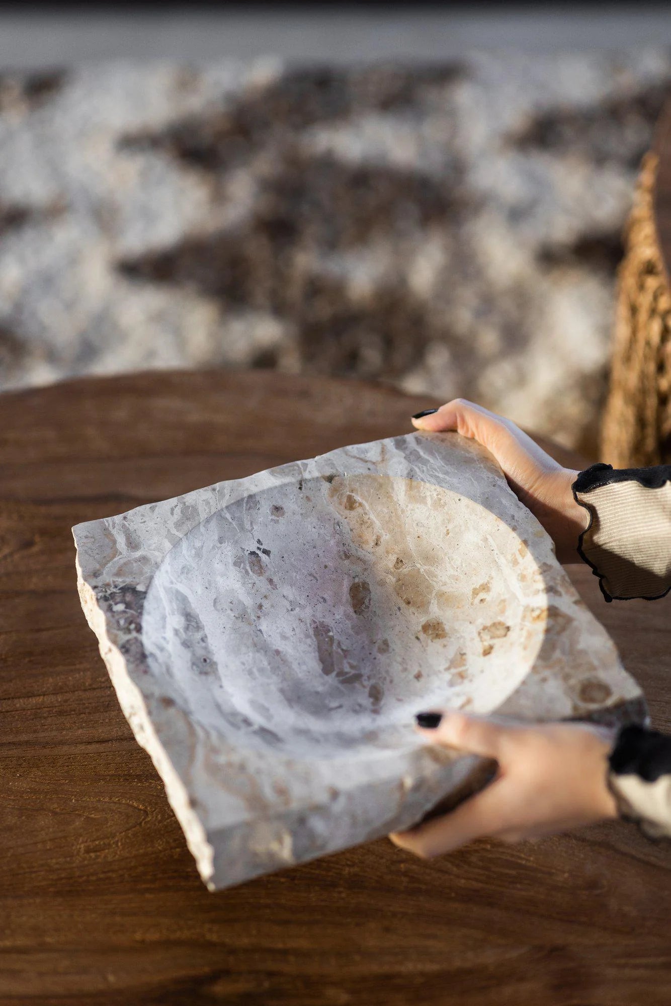 Aya is a chic, square-shaped marble bowl with a raw, unrefined finish that gives it a beautifully natural look. Its uneven edges add a rugged charm, enhancing its organic and minimalist appeal. Aya is a distinctive and elegant piece that effortlessly stands out in any space. Whether left empty or filled, this exclusive bowl adds a touch of sculptural sophistication to your home.