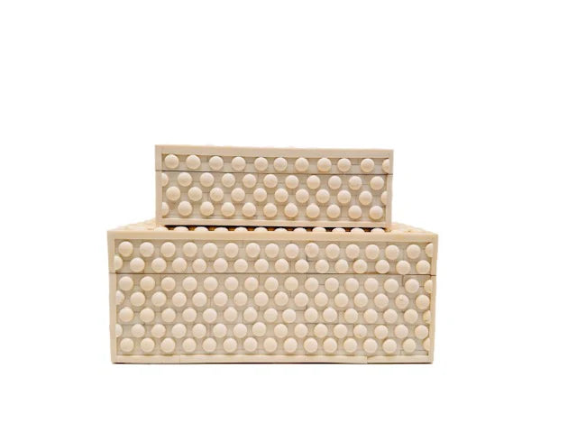 The White Bone Box with 3D Bubble Design by A. Sanoma is a meticulously handcrafted piece that combines artistic flair with functional storage. Made from natural bone, each box features clusters of small three-dimensional bubbles, adding texture and visual interest to any space. Ideal for storing jewelry, keys, or small essentials, it enhances coffee tables, shelves, or desks with refined, artisanal elegance. Stack multiple sizes together or display individually for a curated, sophisticated look.