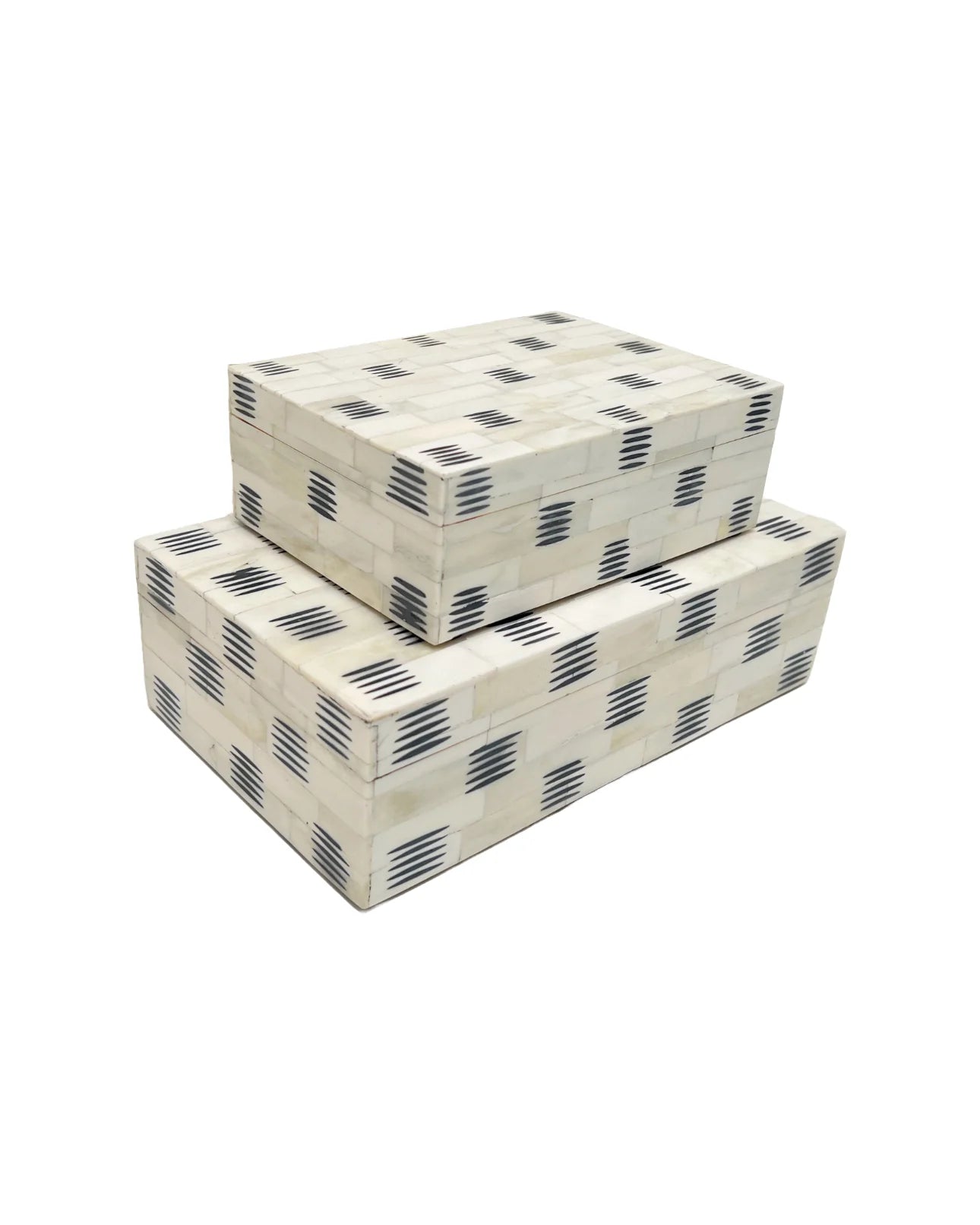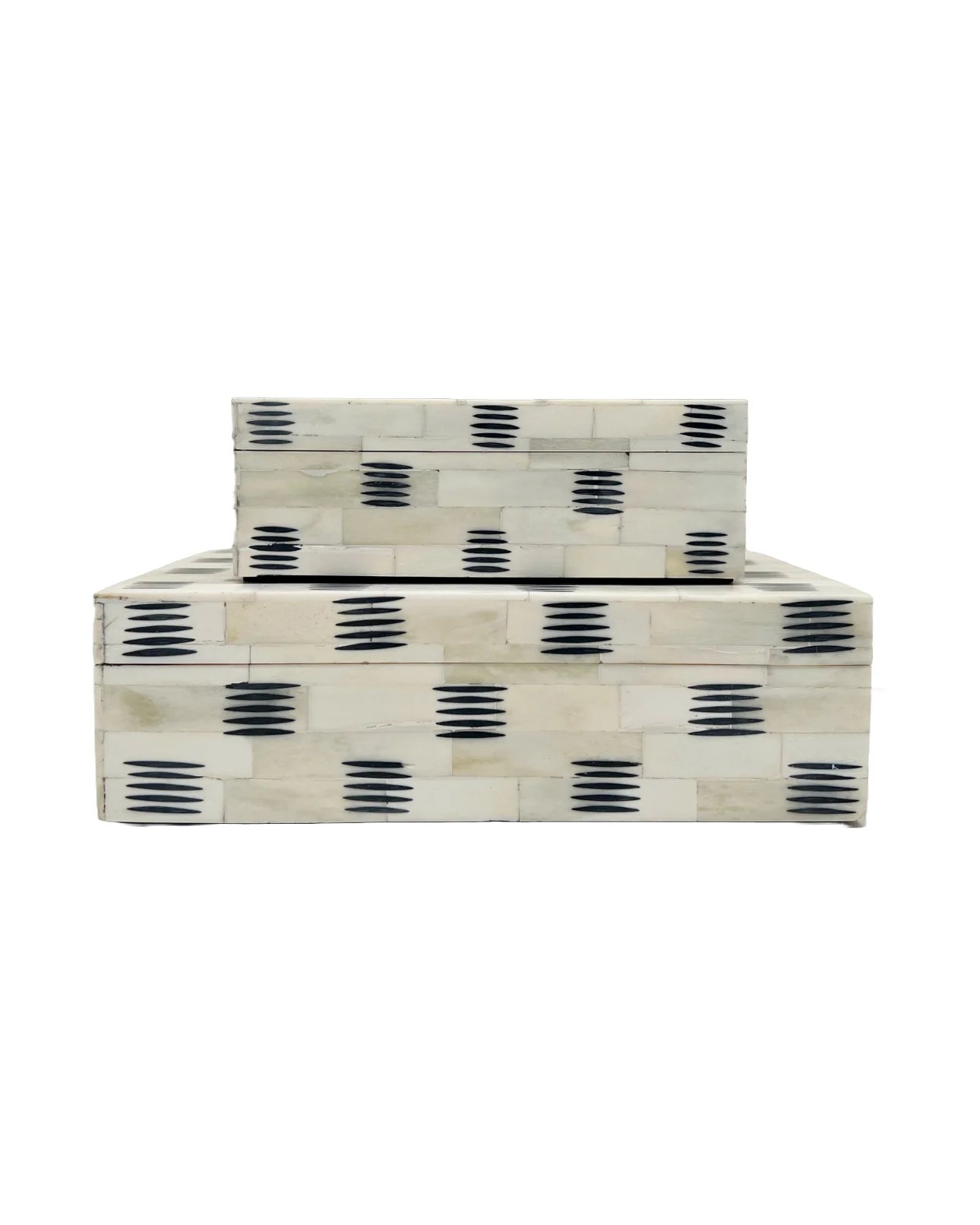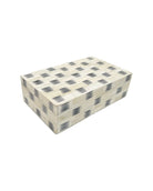 The White Bone Box with Blue Stripe Pattern by A. Sanoma is a striking blend of artistry and functionality. Handcrafted from natural bone, it features intricate blue striping that forms a captivating grid of small squares, making each piece uniquely mesmerizing. Perfect for storing jewelry, keys, or small essentials, it adds texture and visual interest to coffee tables, shelves, or desks. Display it solo or layer with other boxes for an elevated, curated look.