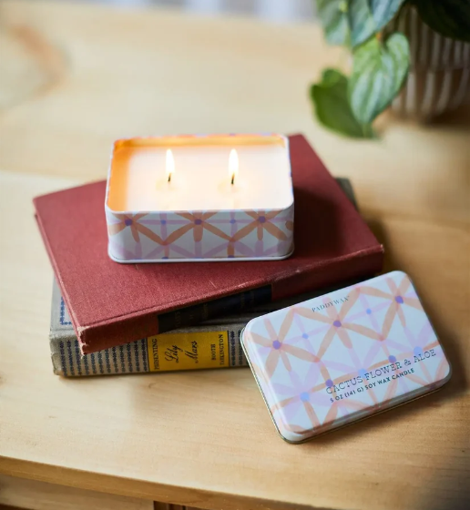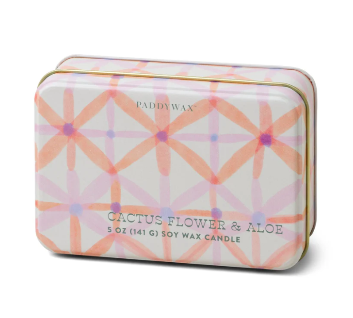 Bring a playful pop of pattern and fragrance to your space with the Everyday Tins – Cactus Flower & Aloe. This 5 oz tin features two wicks for an even, radiant burn and a lively floral design that adds effortless charm to any room. The scent opens with bright bergamot, dewy pear, apple blossom, and coconut water, unfolding into soft, blooming notes of cactus flower, gardenia, white peony, and aloe vera. A warm, grounding base of matcha tea, muguet, vanilla bean, and bamboo rounds out the fragrance for a fresh, uplifting everyday burn. Easy to stack, simple to store, and perfect for collecting, this cheerful tin brightens your day—again and again.