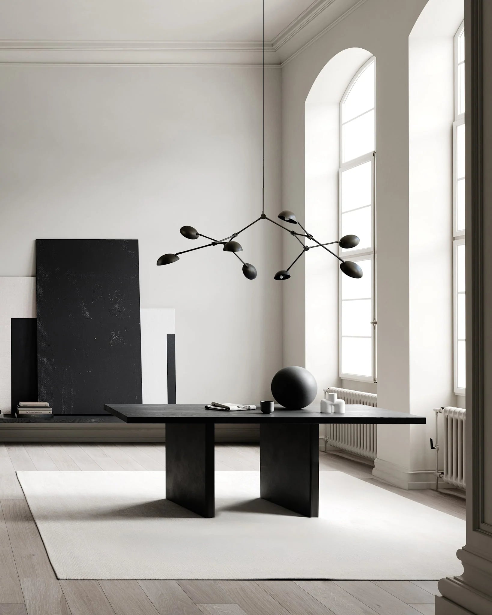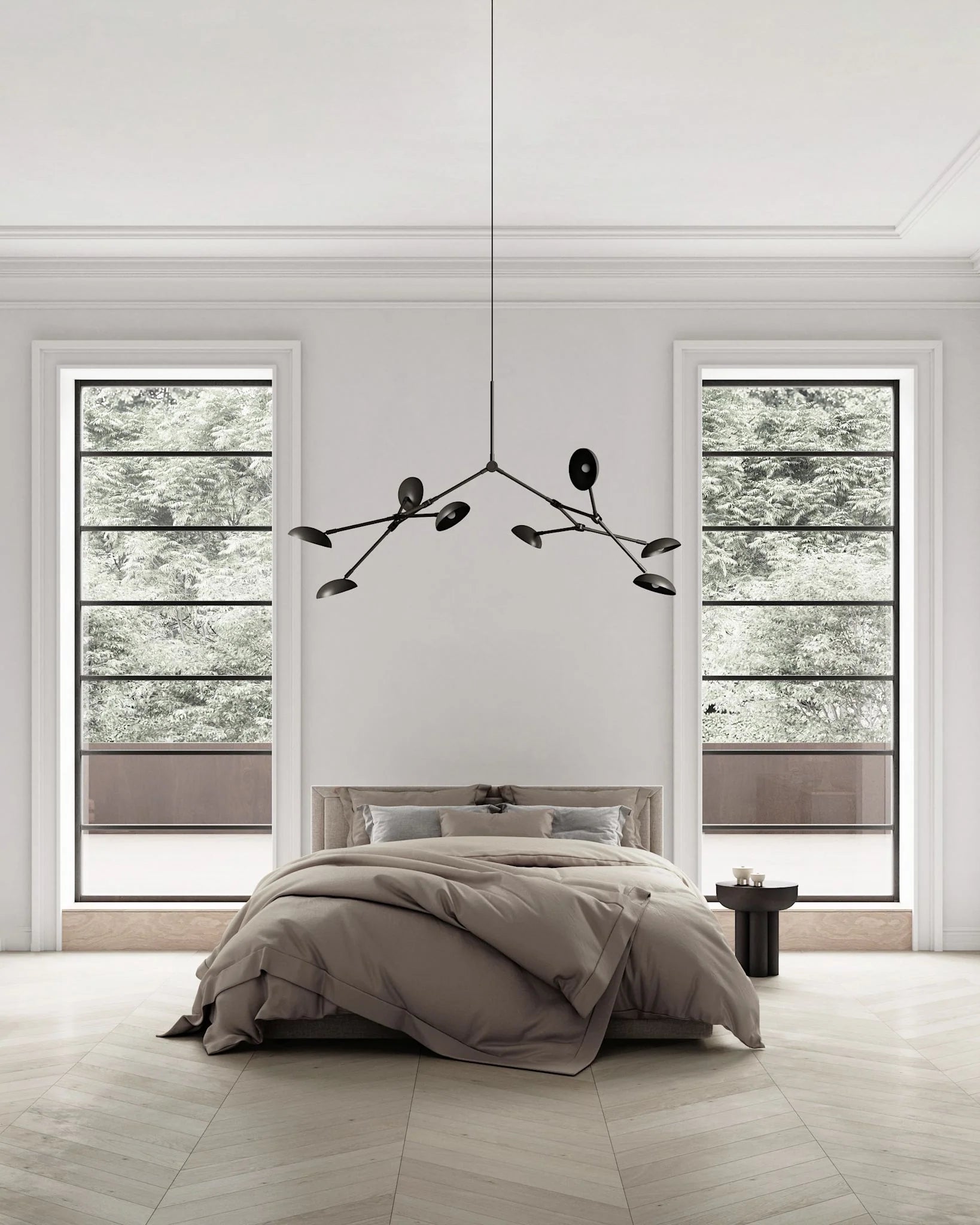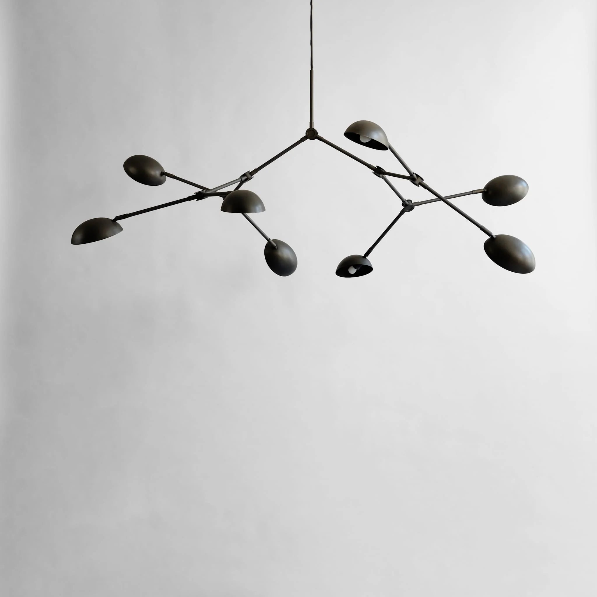 With 14 adjustable arms and gracefully curved shades, the chandelier invites endless configurations—each casting a dynamic play of light that transforms its surroundings. Available in a raw oxidized finish and plated options including brass, bronze, and burned black, every piece is hand-brushed for a refined, artisanal touch.