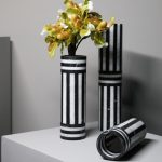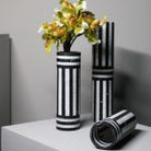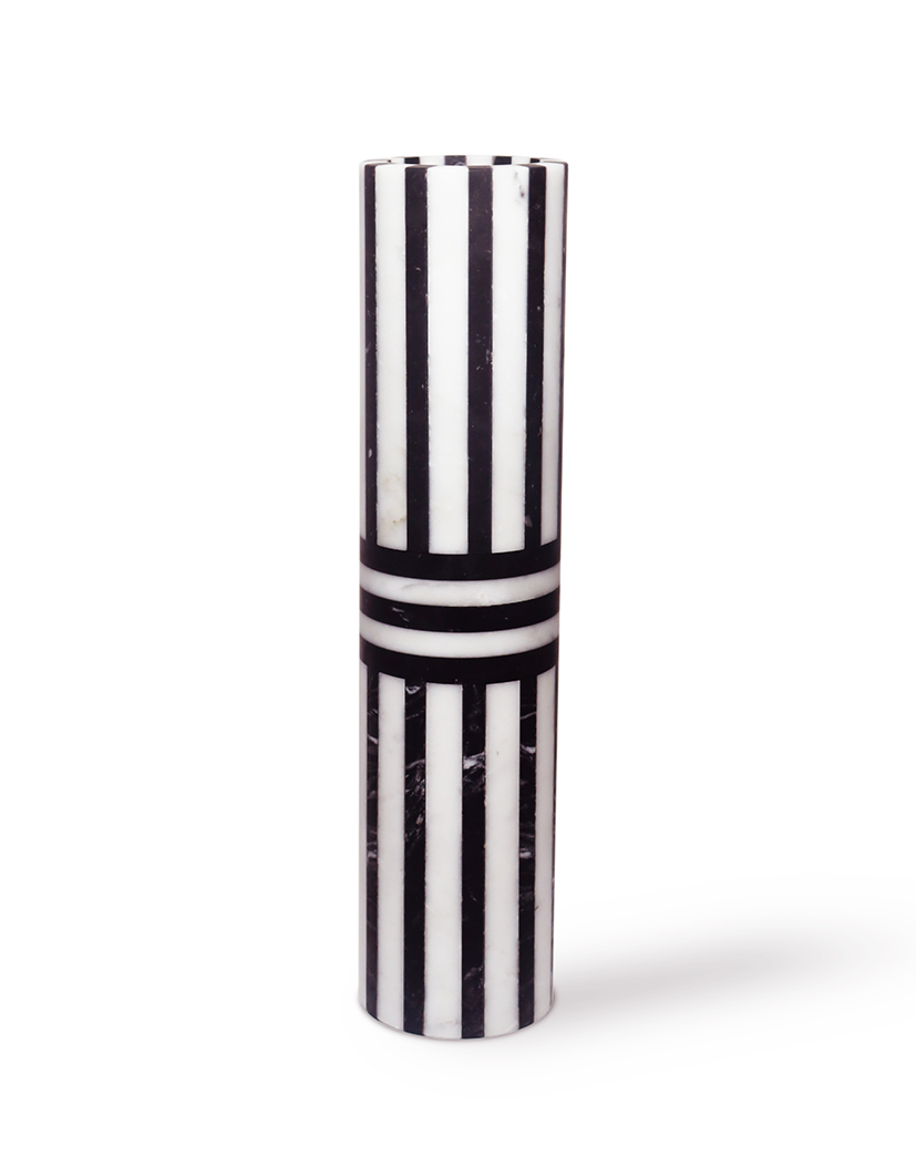 Handcrafted in Italy from the highest quality stone, the Bloom Vase High is a striking celebration of material and form. Its solid cylindrical silhouette is enhanced by a bold striped pattern created through the alternating use of white Arabescato and black Marquina marble. Sculptural and timeless, this vase can be displayed on its own or paired with other sizes from the Bloom collection to create a dynamic, architectural composition.