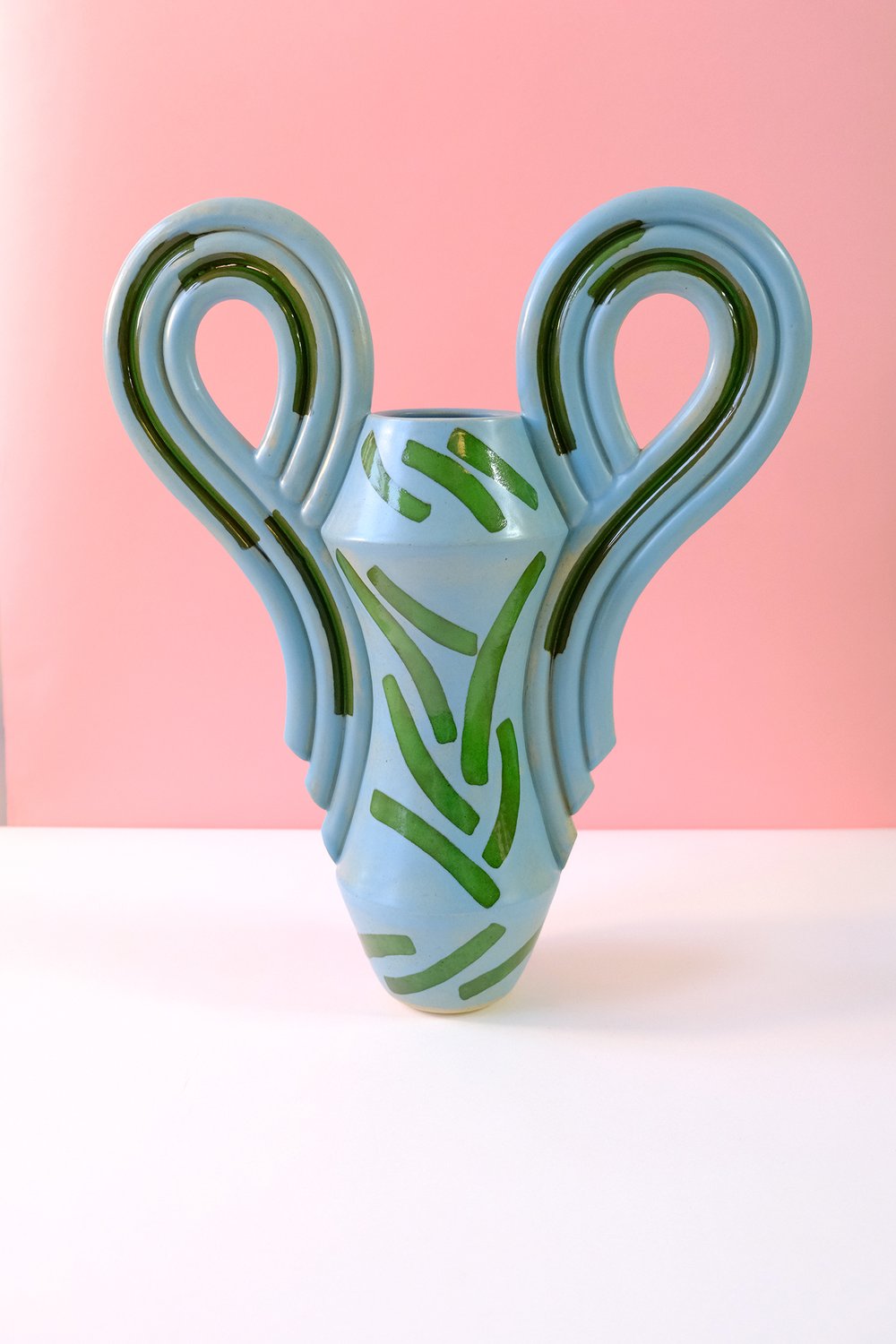 The Deco vase in baby blue with grass green shapes evokes the elegance of architectural design, featuring coiled handles that capture motion frozen in time. The soft-to-the-touch surface invites handling, while the vibrant pattern adds a playful yet sophisticated charm.
