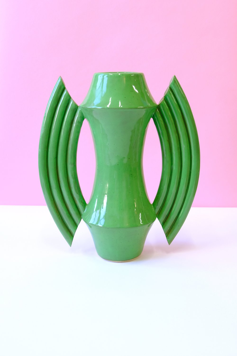 Each vase is wheel-thrown in two sections and assembled with care to ensure perfect geometry. The coiled handles are shaped while still wet to preserve their bold curves, then carved and attached by hand before undergoing a meticulous 4-week drying process.