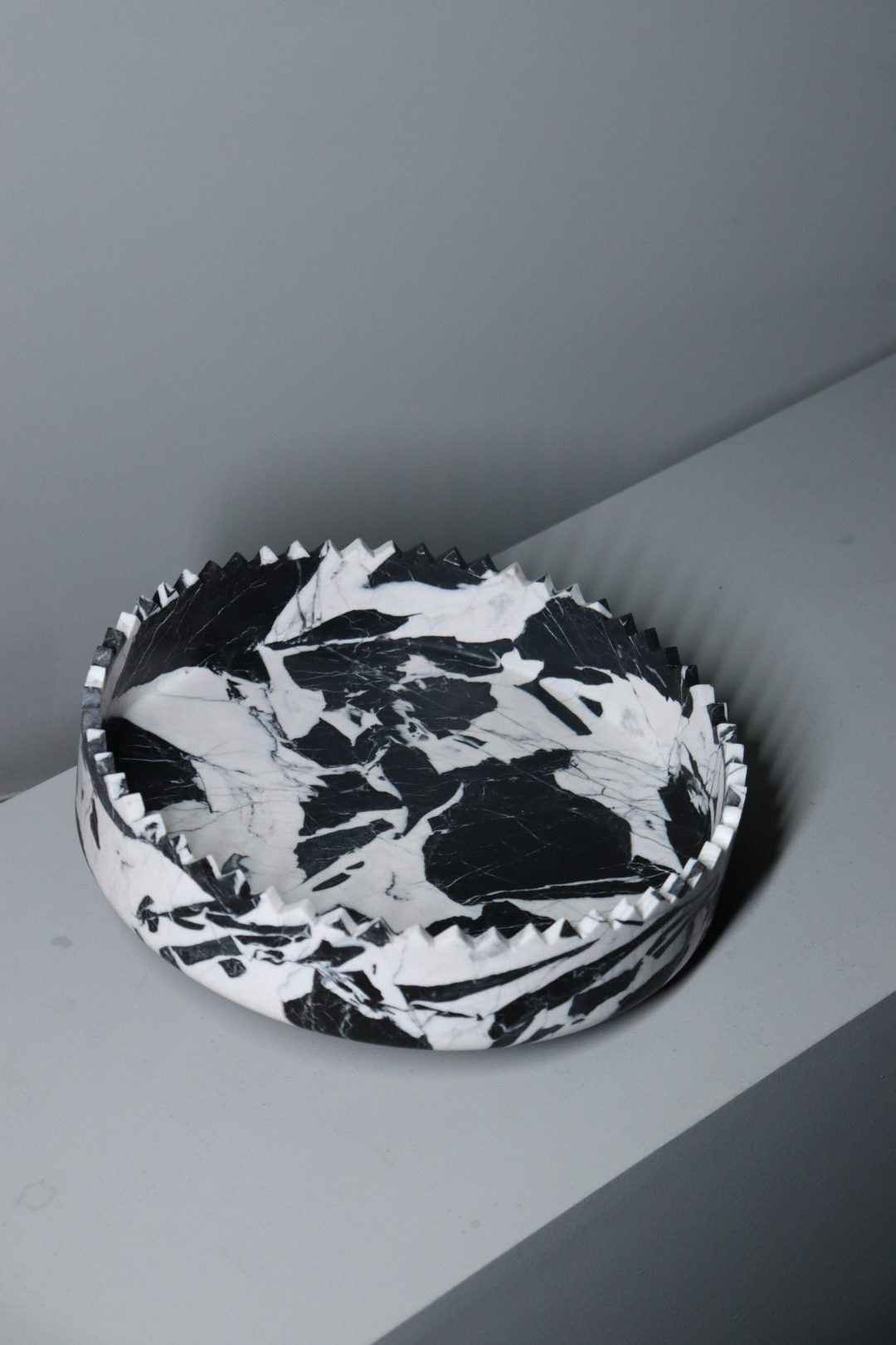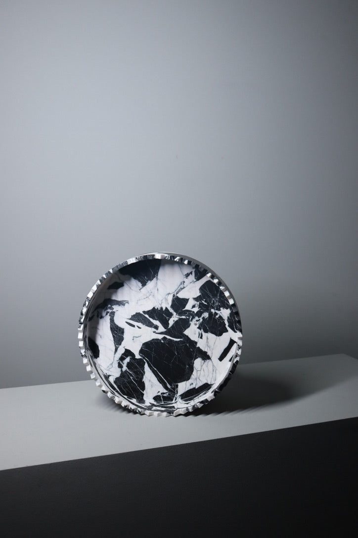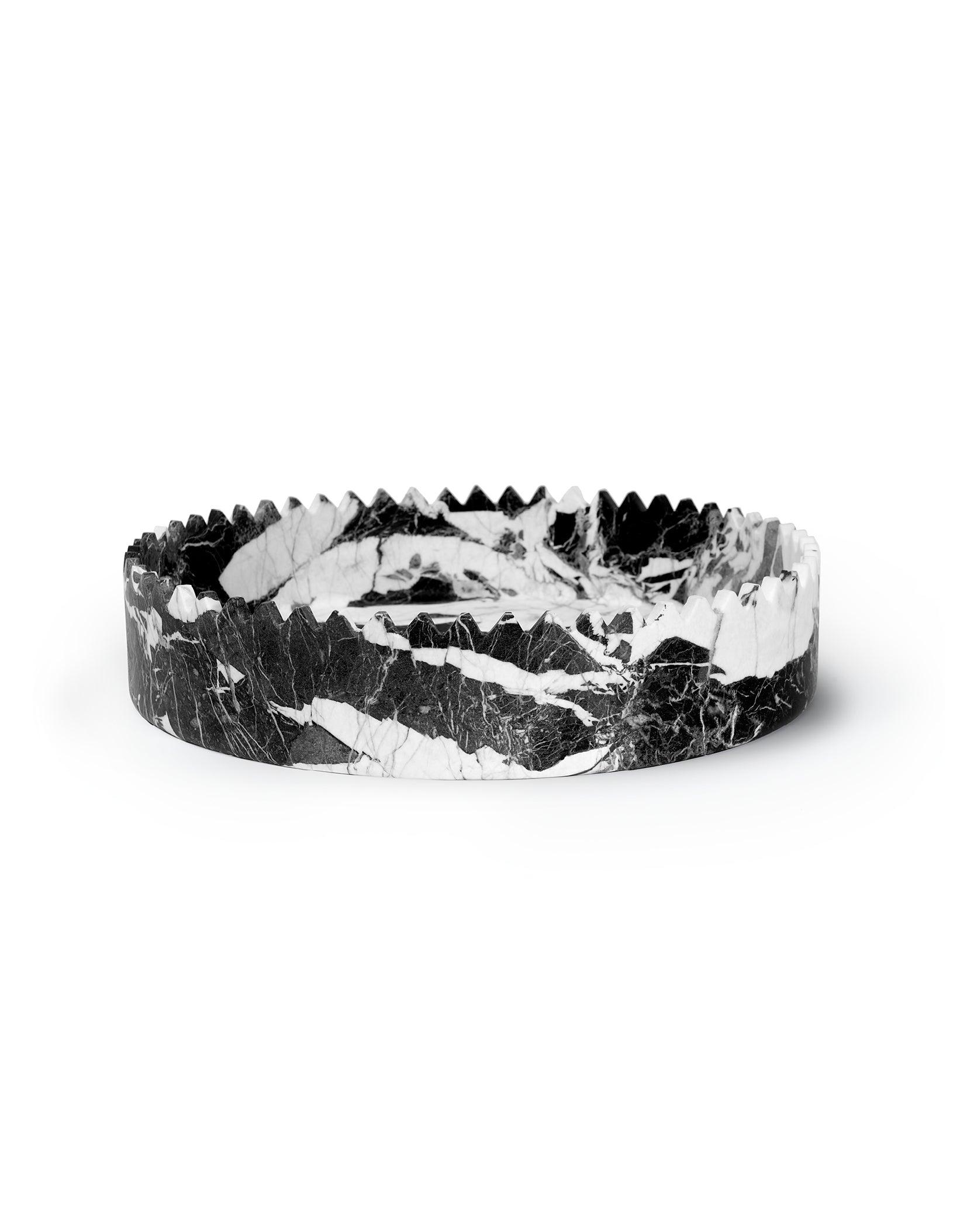 Triangoli Centerpiece Grand Antique is hand-carved in Italy from blocks of Grand Antique marble, a “new” old marble. This stunning black and white stone was widely used during the Roman empire before the quarry was abandoned for centuries. Now the quarry is again open and active. This marble is characterized by bright white veins on a deep black uniform background, featuring a unique texture. Triangoli Centerpiece Grand Antique is part of the Triangoli collection of table tops.