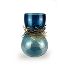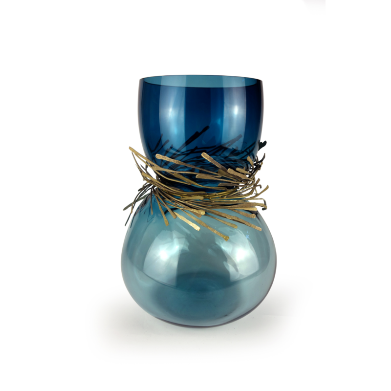 The Cabaret Vase – Duck Blue by Vanessa Mitrani is a striking dialogue between color, form, and structure. Hand-blown glass in a deep duck blue is encased in a sculptural metal framework, creating a dynamic tension that highlights both fluidity and precision. The rich, luminous hue contrasts beautifully with the architectural lines of the metal, making the piece both functional and sculptural. Elegant, modern, and visually commanding, the Cabaret Vase – Duck Blue adds depth, artistry, and contemporary sophistication to any interior.