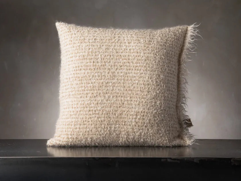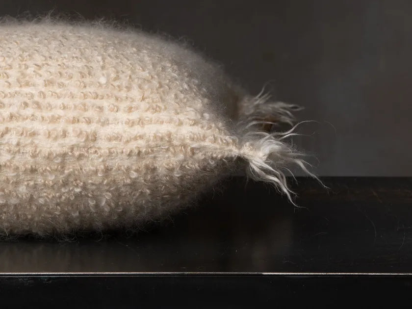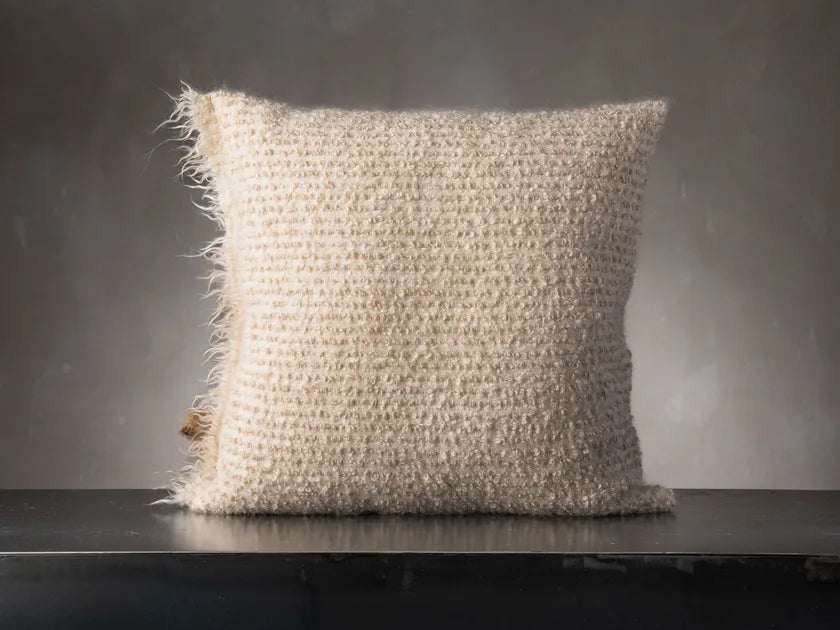The ARIETE Cushion features a loose weft weave crafted from naturally curly wool fibers, offering a rich, tactile experience. Its texture evokes the legendary flock of the Cyclops Polyphemus, blending mythology with materiality. Inspired by Ulysses’ clever escape—clinging to the Cyclops' prized ram—ARIETE is both a tribute to storytelling and a celebration of craftsmanship. A striking piece that adds depth, softness, and narrative to any space.