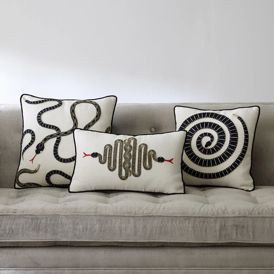 Hand-embroidered with a corded edge, our Eden pillow features our signature slithering serpent in classic black and ivory with a bold red tongue. Bring edgy glamour to any pillowscape, or perk up your reading chair with striking style.