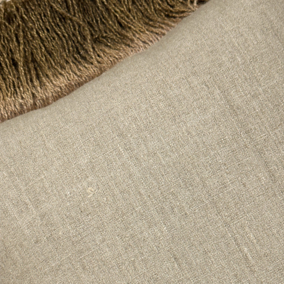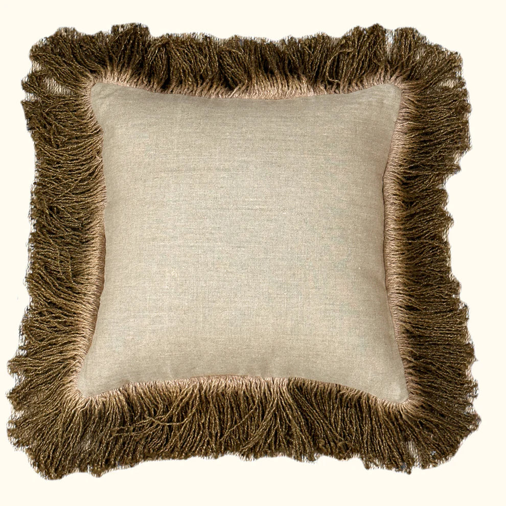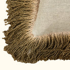 The Jute Fringe Pillow (20" x 20") in Bronze by Threads Soft Goods combines natural texture with a warm, earthy tone. Crafted from durable jute-blend fabric with fringe detailing, it adds artisanal charm and visual interest to sofas, chairs, or beds. Stylish and versatile, this pillow brings a cozy, modern touch to any décor.