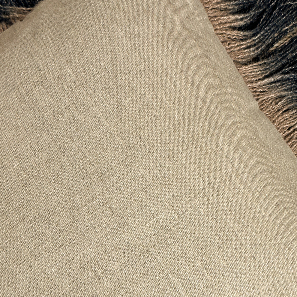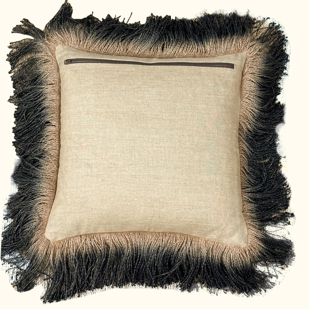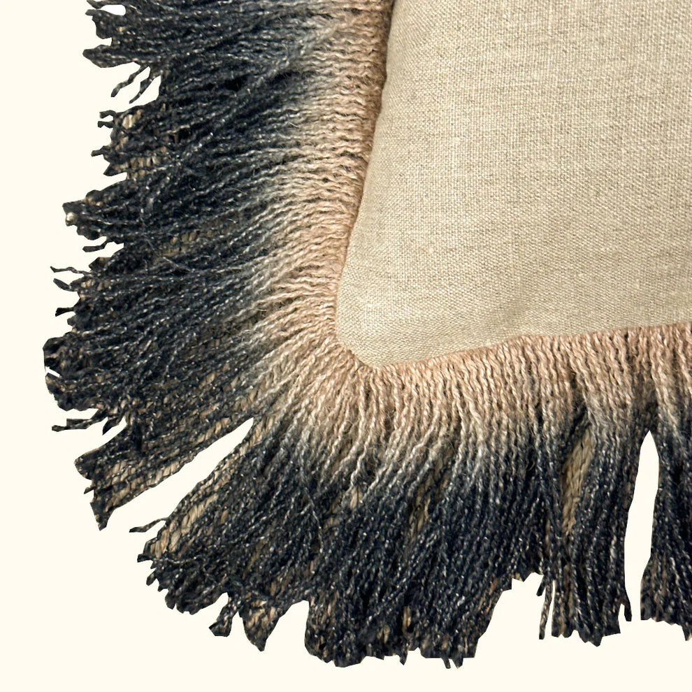 The Jute Fringe Pillow (20" x 20") in Carbon by Threads Soft Goods features rich, dark tones paired with natural jute texture for a striking, modern look. Crafted from durable jute-blend fabric with fringe detailing, it adds depth and artisanal charm to sofas, chairs, or beds. Elegant and versatile, this pillow brings contemporary style and warmth to any space.