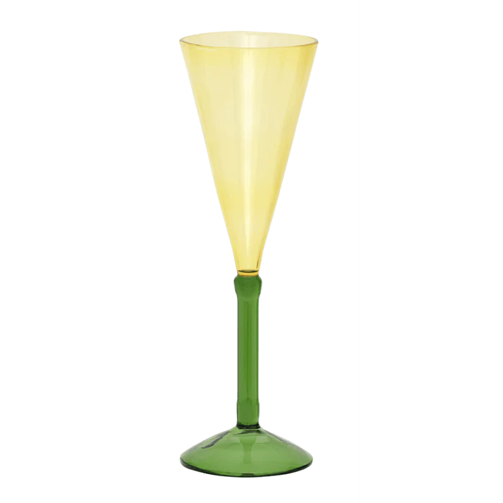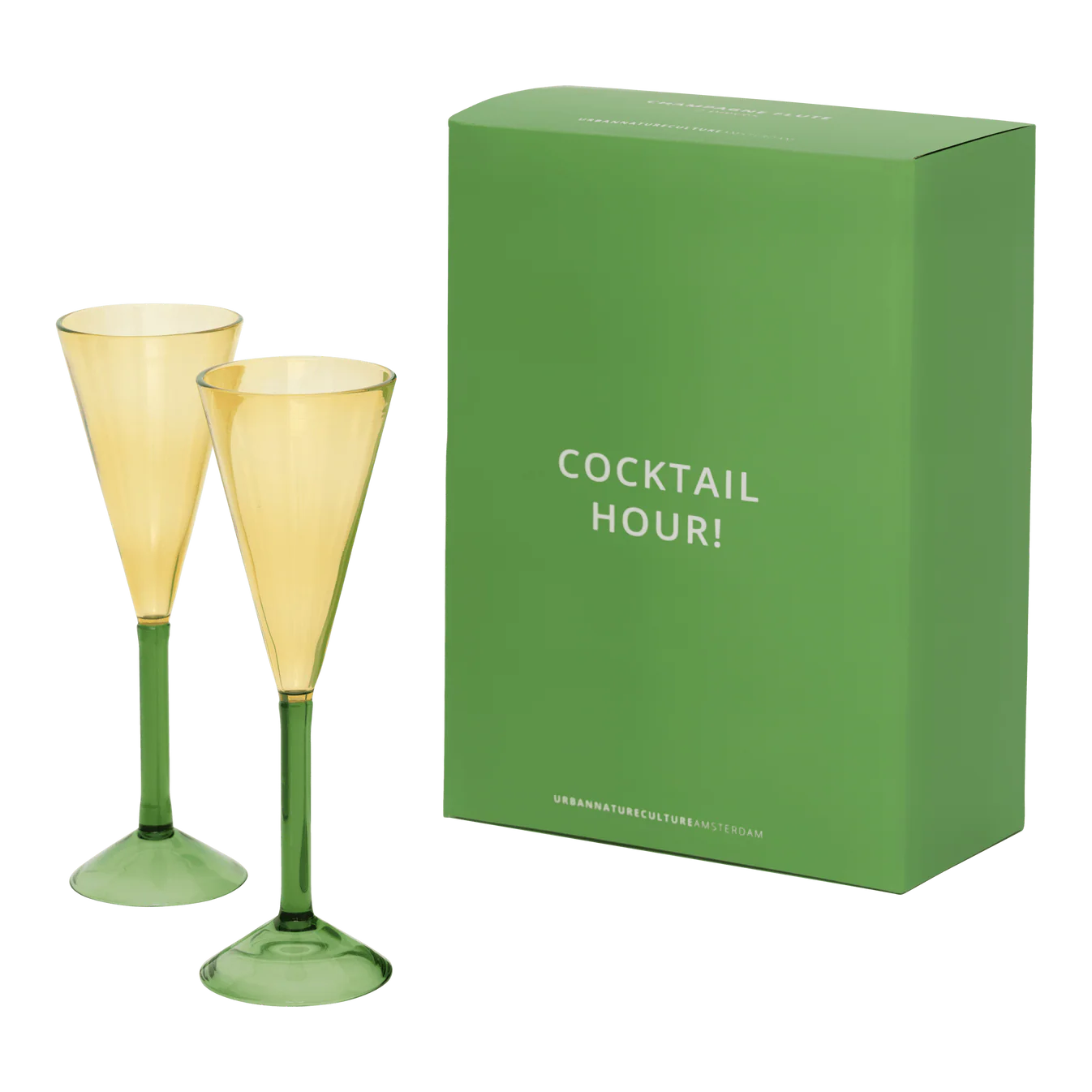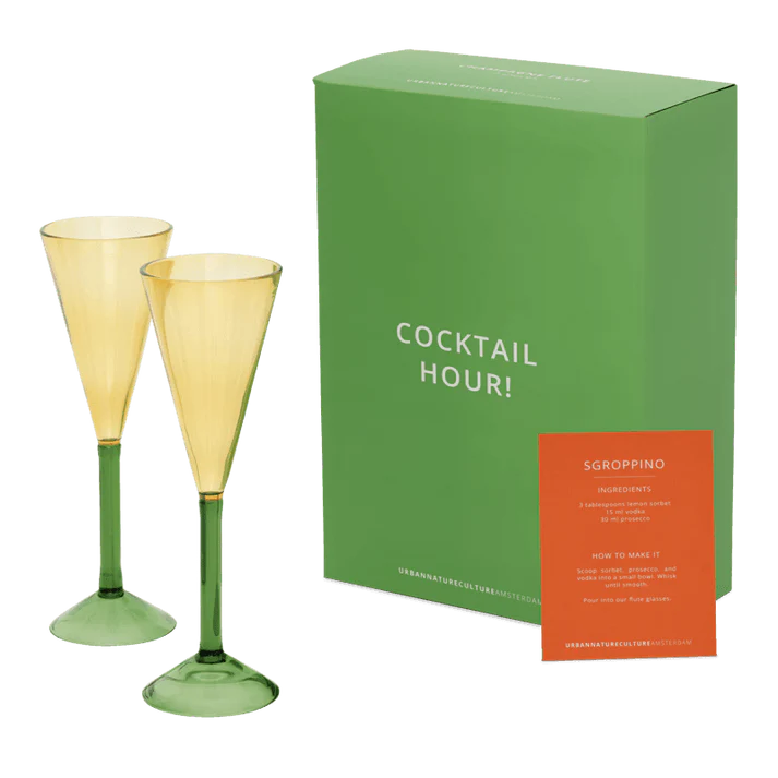 Cocktail hour has kicked off at Urban Nature Culture! As an exclusive design for Urban Nature Culture’s Fall & Winter 2024 collection, the Amsterdam based company brings a brand new series of 4 different cocktail glasses. All four of them unique, with their own classic shape- perfectly matching the drinks you're serving. Party business kicks off with the vibrant colours of the cocktailglass flute. Made of borosilicate glass in an exciting, colourful mix of lemon and green, it serves champagne, bellini’s, scroppino’s and more. UNC presents the cocktailglasses in a special, celebratory giftbox as a set of 2, including a recipe card for cocktails- to create your own. A great gift for the holiday season or as a housewarming gift. Mix it up, serve and enjoy happy hour at home. This cocktail glass is the finishing touch to every party.