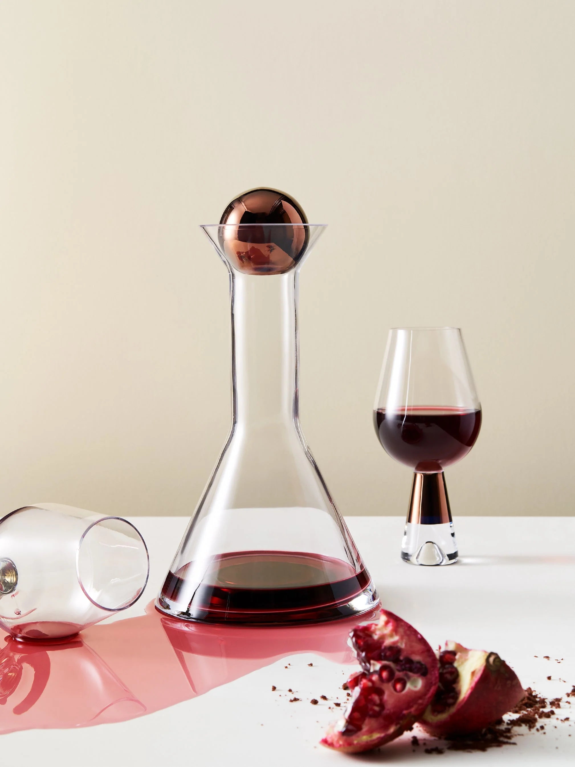 The Tank Decanter – Copper takes its cues from the precise forms and volumes of scientific glassware, reimagined with contemporary elegance. Crafted from mouth-blown glass in Poland, the decanter is finished with a warm copper-toned sheen that adds distinctive sophistication. Featuring a polished edge and a balanced, sculptural silhouette, the piece is both functional and visually striking. With an etched Tom Dixon logo subtly sand-blasted on the base, the Tank Decanter – Copper transforms wine service into a modern, design-forward experience.