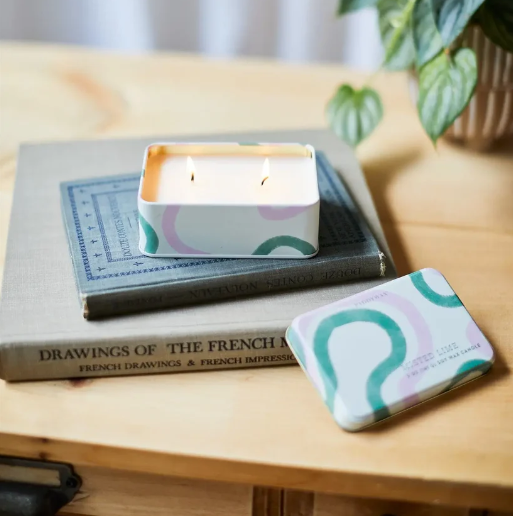 Add a playful pop of pattern and fragrance to your space with the Everyday Tins – Misted Lime candle. This conveniently sized 5 oz tin features two wicks for an even, radiant burn and a lively swirl design that brings a touch of fun to any room. Fresh and lightly sweet, the scent opens with bright citrus lime blended with raspberry blossom and crisp apple, unfolding into soft floral notes of jasmine and rose. A warm base of musk, oakmoss, and amber grounds the fragrance for a balanced, everyday burn. Easy to stack, simple to store, and perfect for collecting, this cheerful tin is made to brighten your day—again and again.