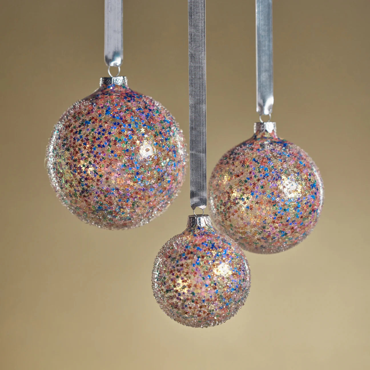 The Confetti Glass Ball Ornament – Multi Bright (4.75") by Zodax is a festive statement piece that brings color and sparkle to holiday décor. Crafted from glass with a shimmering multicolor confetti finish, it reflects light with joyful brilliance. Larger in size, it’s perfect as a standout ornament on the tree or styled with smaller sizes for a vibrant, layered holiday display.