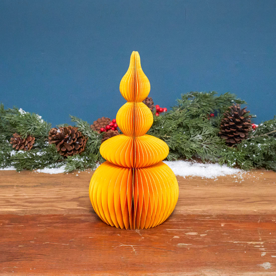 Add a festive touch with the Recycled Paper Tree in Marigold, crafted from eco-friendly recycled paper. Its accordion-style silhouette and vibrant hues offer a blend of elegance and playfulness, making it a standout piece for the holiday season. A sustainable statement that brings charm to any space.