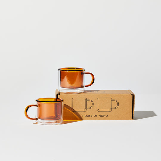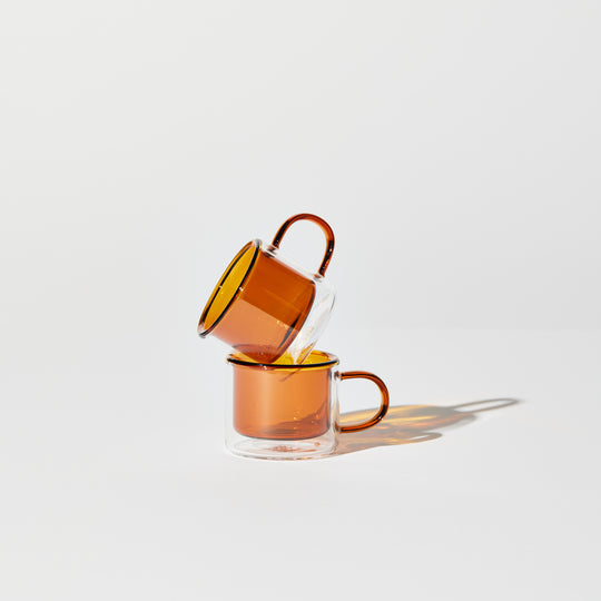 The Nunu Double Trouble Cups in Amber come as a playful set of two, celebrating those essential “partners in crime” in our lives. Crafted from heat-resistant borosilicate glass with a durable double-wall design, they keep your tea or coffee warmer for longer while remaining comfortable to hold. Hand washing is recommended to ensure lasting use.