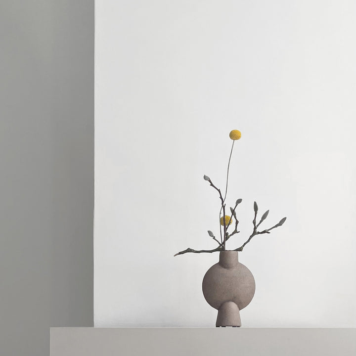 A signature of 101 Copenhagen, the Sphere collection is defined by its sculptural forms, ornate detailing, and rich surface textures. Inspired by ancient Chinese ceramics, each vase is crafted in muted earth tones, developed with expert ceramists to achieve a refined contrast of curves and sharp lines. Hand-glazed for a unique finish, every piece includes a bag for fresh flowers, though it is not fully waterproof.