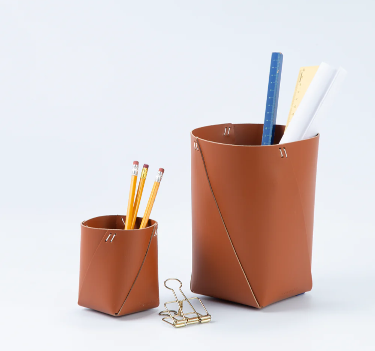 Pen holder and desk organizer, sober, simple and stylish. It can be used both at home and in the office. It is a sustainable and durable product, handmade with 100% recycled leather.
