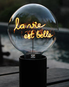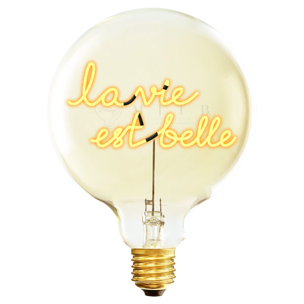 The MITB “La Vie Est Belle” Amber Bulb by Elements Lighting is a beautifully optimistic piece from their Message in a Bulb collection. Crafted from warm amber glass in a classic E27 shape, the delicate LED filament spells out the uplifting phrase “La Vie Est Belle” (“Life is Beautiful”), casting a soft, radiant glow that inspires joy and gratitude. Ideal for bedside lamps or cozy corners, it’s both a functional light source and a decorative object that brings a meaningful message into your space.