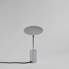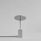 Above, a circular metal reflector is supported by a slender vertical rod, connected with a flexible joint that allows for intuitive light adjustment. Angle the reflector downward to create a cozy, intimate atmosphere, or rotate it upward to illuminate surrounding objects or architectural features.