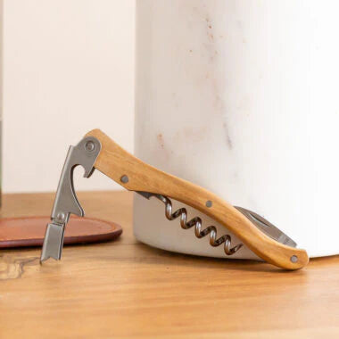 Timeless and refined, the Olivewood Corkscrew in Leather Pouch by French Dry Goods is a true essential for wine lovers. Handcrafted in France, the corkscrew features a durable stainless-steel mechanism and a smooth olivewood handle that fits comfortably in the hand. It comes nestled in a rich leather pouch for stylish and protective storage—perfect for gifting or elevating your everyday ritual.