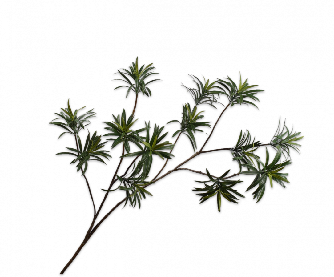 The LEAF SPRAY PODOCARPUS GREY DK, brings subtle sophistication to any arrangement. Its soft grey-green tones and finely detailed podocarpus leaves create a refined, natural look with a contemporary edge. Whether used alone in a tall vase or mixed into a larger display, this spray adds gentle contrast, texture, and a serene, muted elegance to your interior styling.
