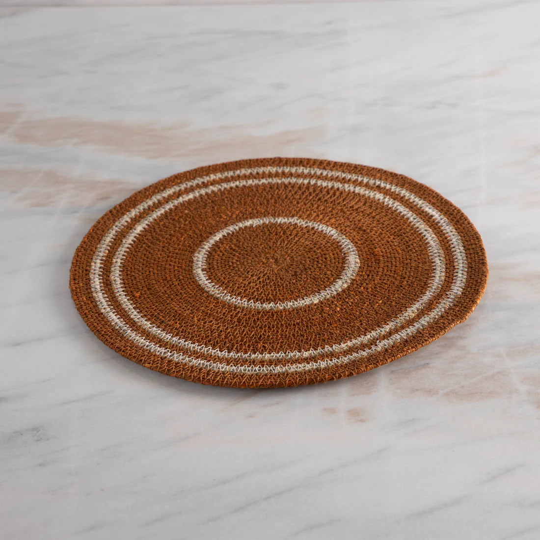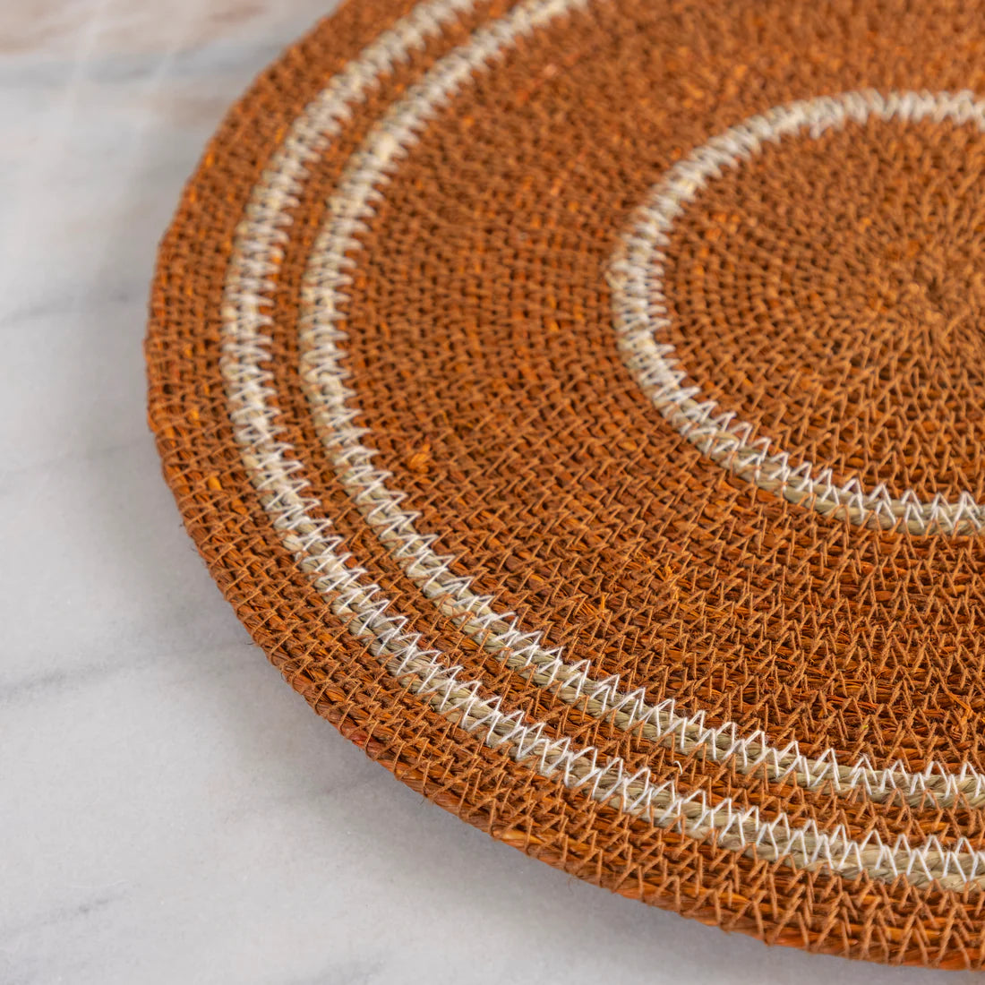 This luxurious placemat, in a striking Rust hue, is expertly crafted from dyed woven seagrass. The unique round shape and subtle white stripes add a touch of sophistication to any table setting. Elevate your dining experience with the Hydra Placemat.