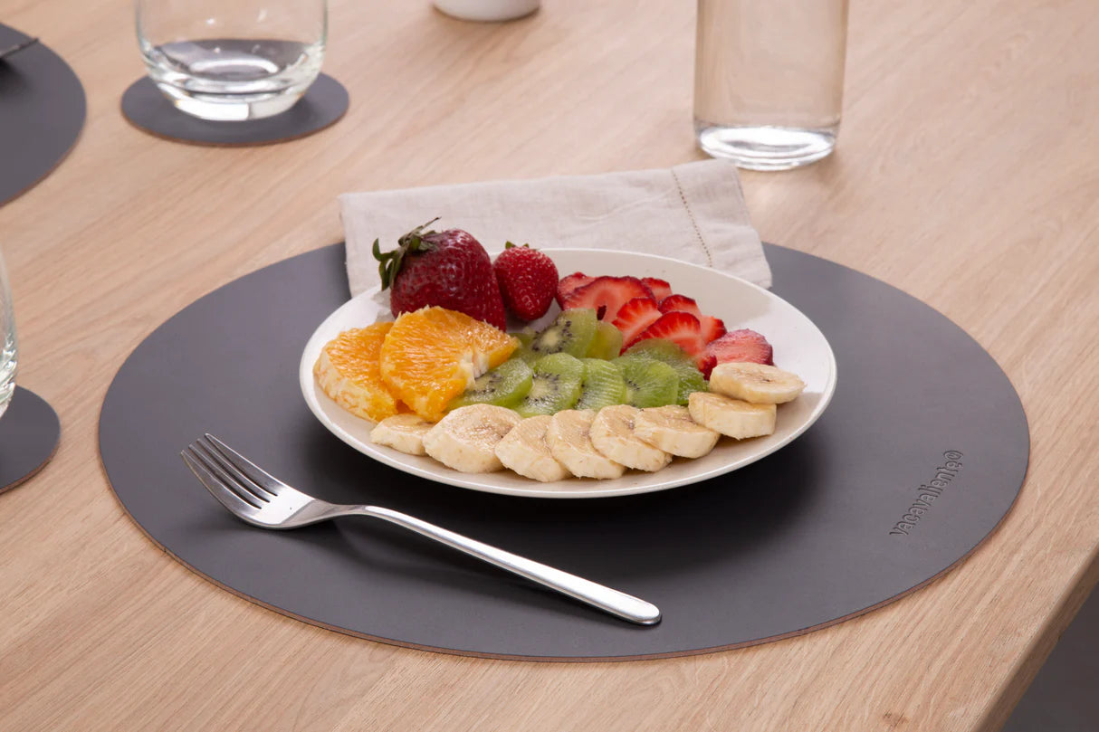 Practical, sober and elegant placemat. It is a sustainable and durable product, handmade with 100% recycled leather.