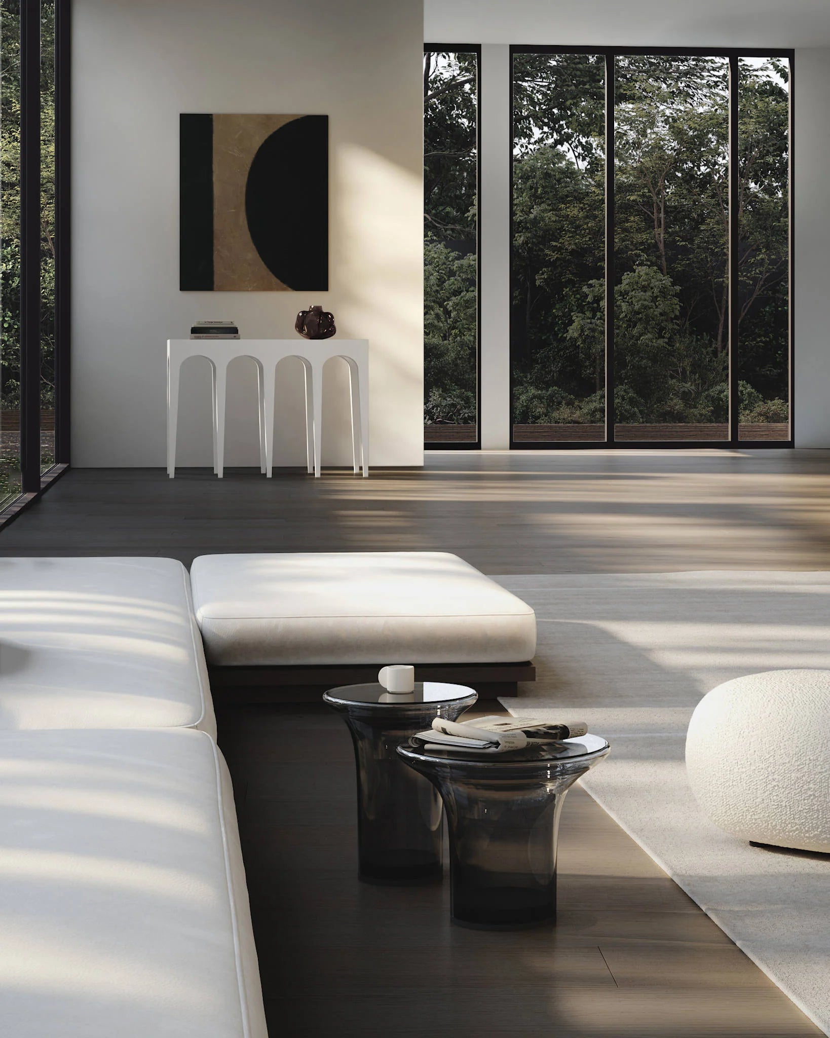 The Trumpet Table, inspired by 1970s design, pairs clean geometry with a flared, trumpet-like base for a bold yet airy silhouette. Crafted from mouth-blown glass, its smooth, reflective surface adds depth and elegance, available in two refined tones—Smoked Forest and Smoked Desert.
