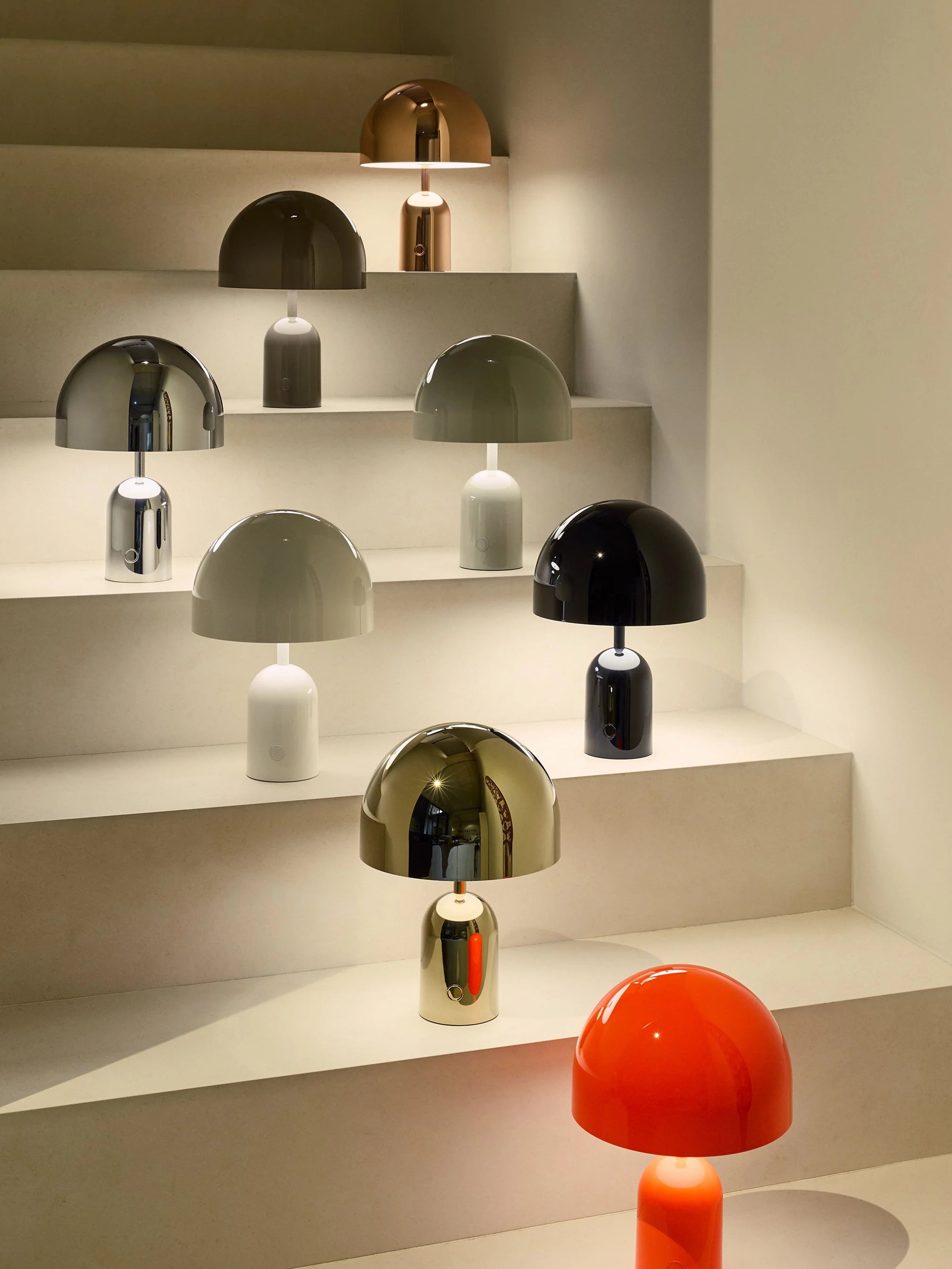 The BELL portable lamp is a minimalist, high-gloss portable lamp inspired by vintage car bumpers. Crafted from plated pressed steel, it mirrors its surroundings while a concealed diffuser emits soft light. This portable light offers 9-hour battery life, indoor-outdoor versatility, energy-efficient LED lighting, and comes with gloves for a fingerprint-free finish.