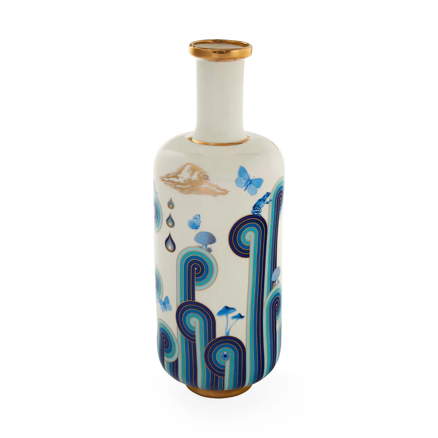 Expand your horizons with dreamy third-eye mindscapes rendered in Delft-inspired blues and accented with real sparkly gold. High-fired porcelain elevates the experience. Our Druggist Tall Bottle Vase features a wraparound design—rotate to refresh your view. A surreal addition to your table, shelf, or mantel. Style it with our other Druggist pottery and create your own dreamscape.