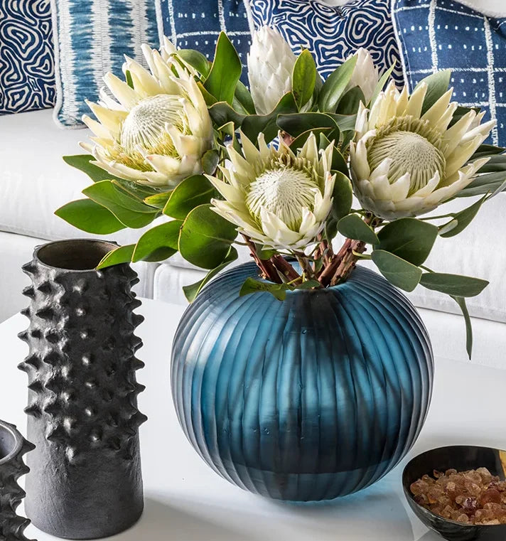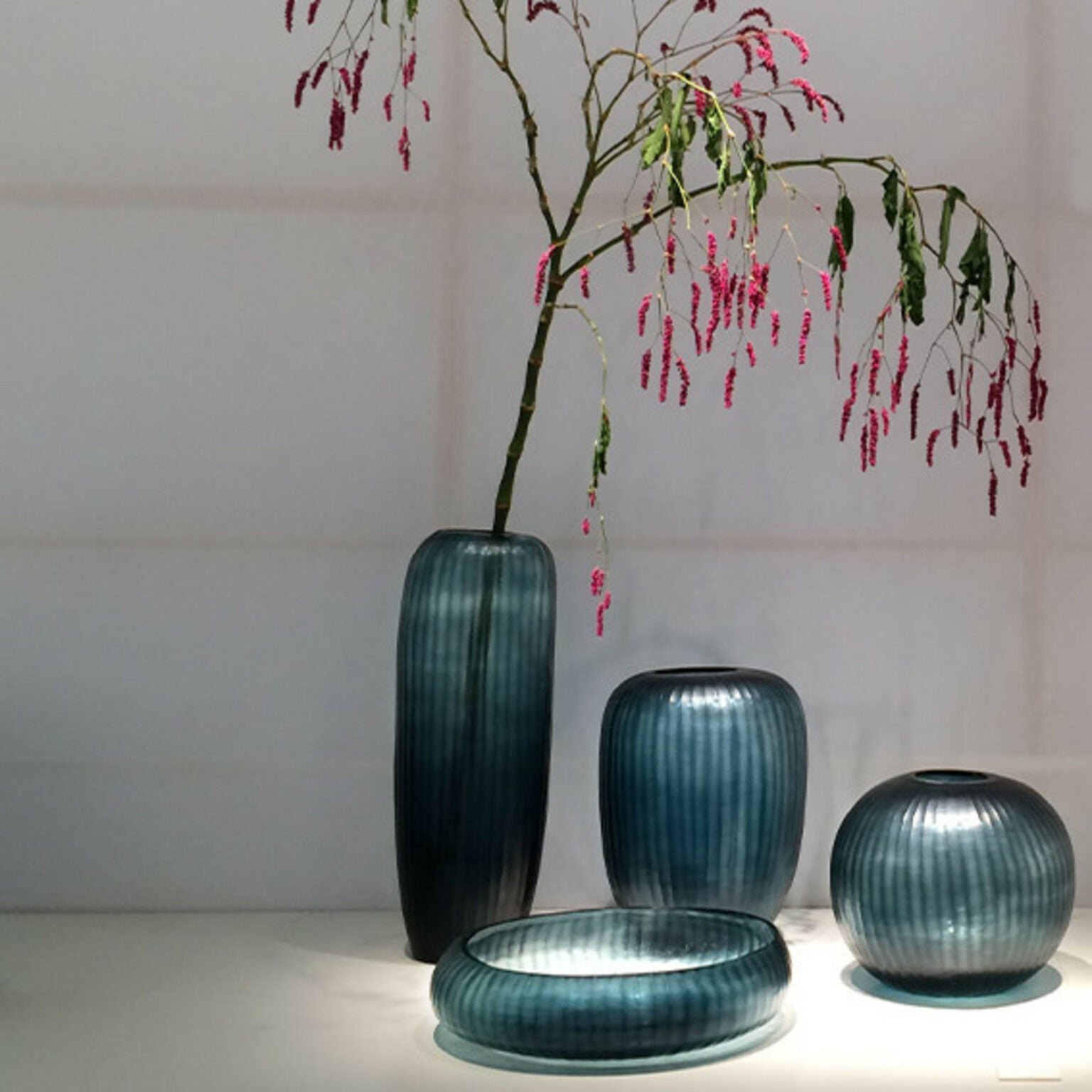 The Gobi Round Ocean Blue/Indigo by Guaxs is a hand-blown glass vase that combines a rounded, sculptural form with deep ocean blue and indigo tones. Its smooth silhouette and subtle color variations highlight the brand’s artisanal craftsmanship, making each piece unique. Perfect as a standalone statement or for shorter floral arrangements, it brings contemporary elegance and a touch of serene sophistication to any interior.
