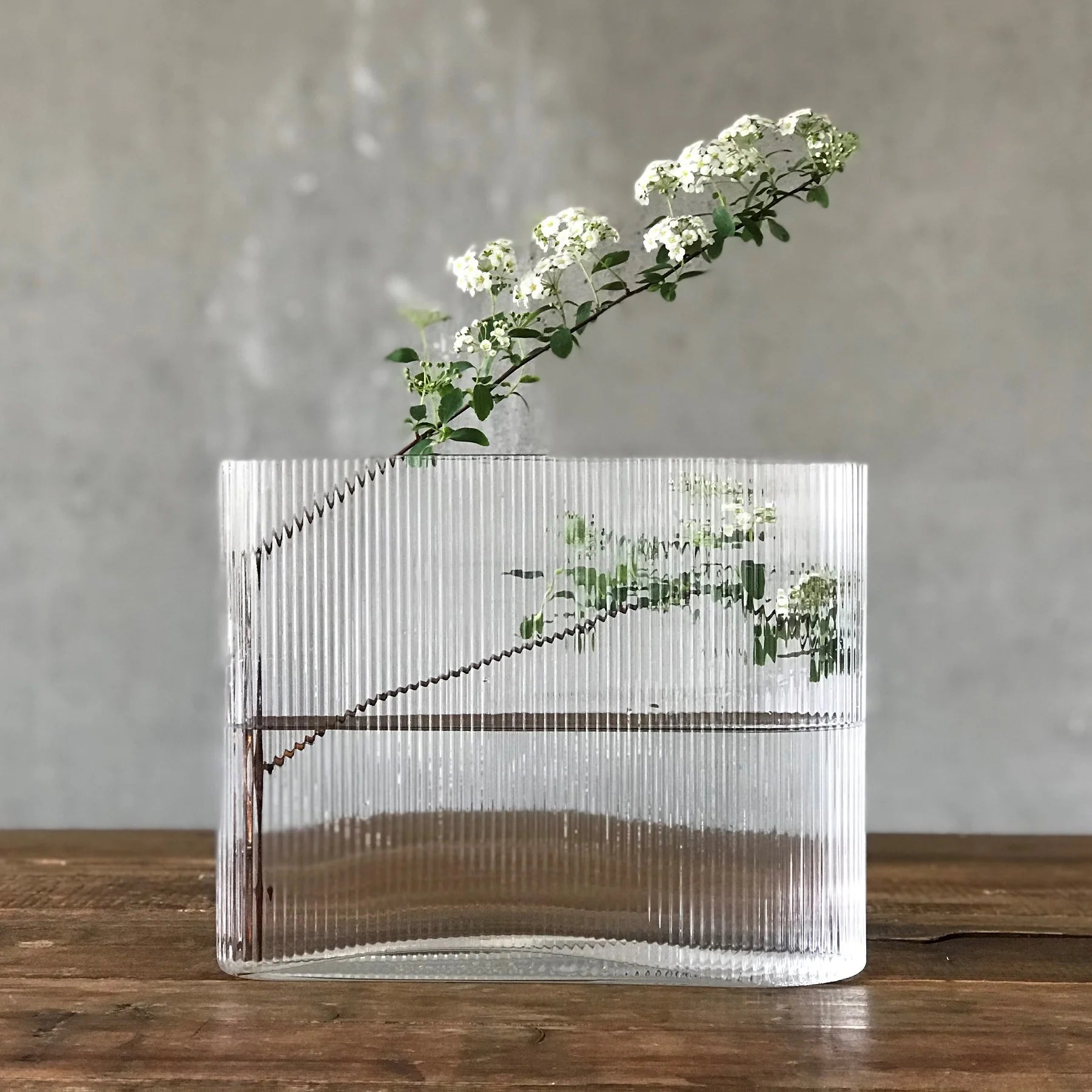 This wide, sculptural vase from the NUDE Mist collection by Tamer Nakisçi is created using traditional glassmaking methods: cast from lead-free corrugated crystal, a simple yet decorative piece is formed. The tactile ripple effect makes the flower stems seem slightly blurred, redirecting the eye to the petals.