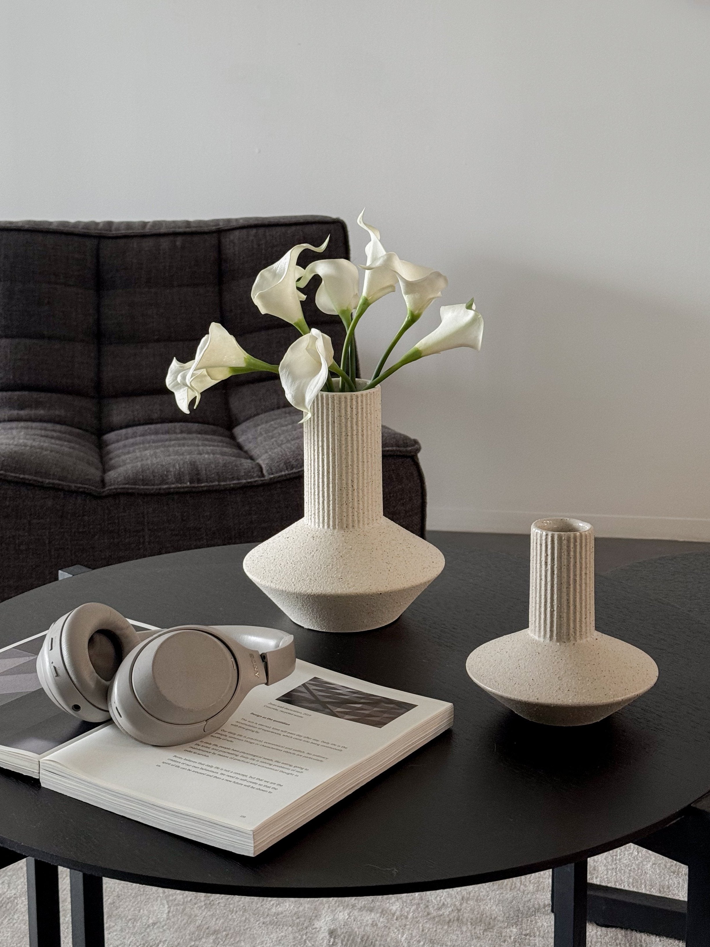 The ROMA vase, made from sturdy earthenware, comes in three unique sizes and colors. Inspired by ancient amphorae and classical architectural columns, its design features a bold, angular base that flows into a narrow, straight neck with delicate ribbed detailing. This refined silhouette enhances the natural beauty of floral arrangements, whether showcasing a single stem or a full bouquet. With its textured surface and warm, sun-kissed feel, the ROMA vase brings a timeless yet modern touch to any interior.