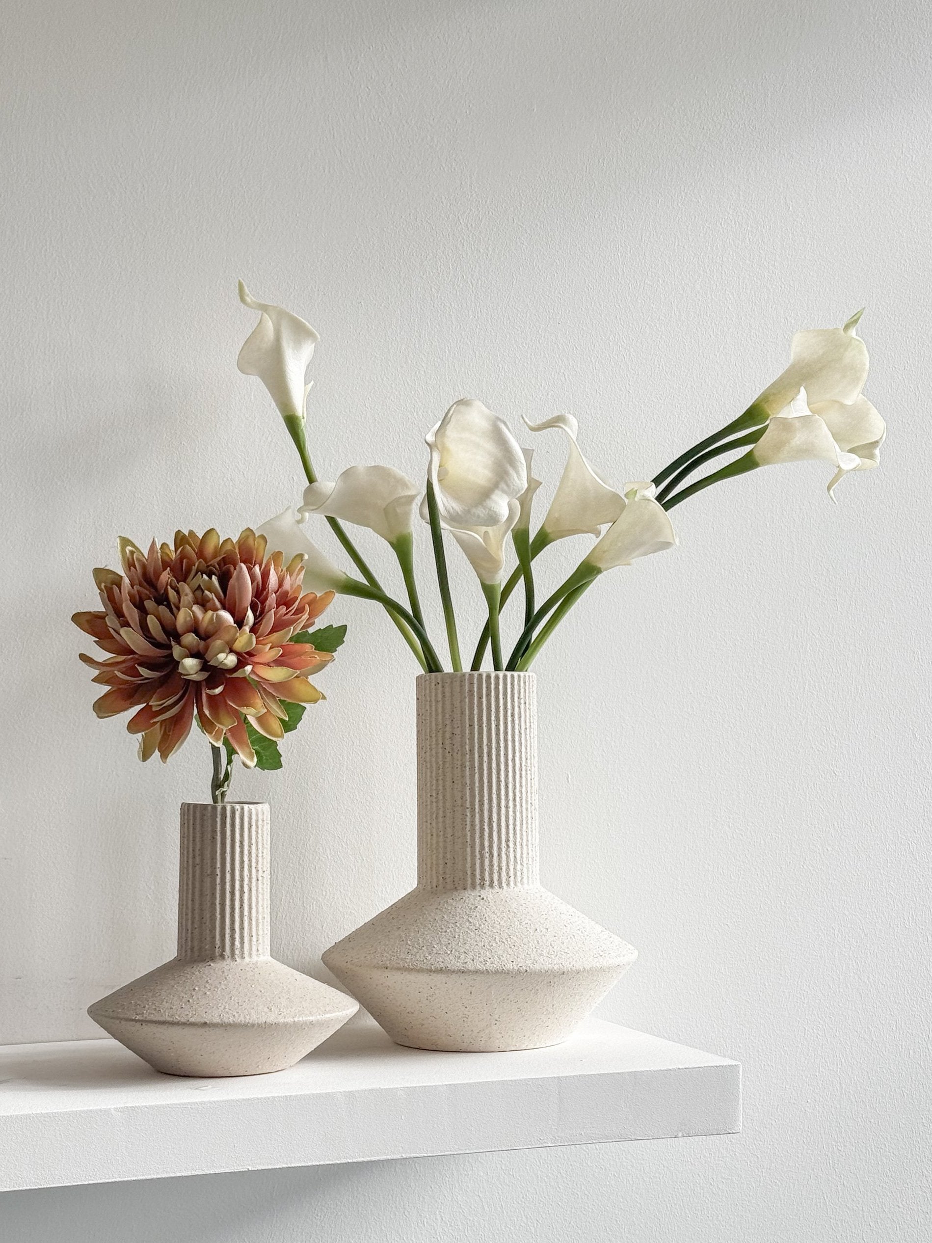 Crafted from durable earthenware, the ROMA vase is available in three stylish sizes and colors. Its form takes cues from ancient amphorae and classical columns, featuring a bold, angular base that flows into a slender, ribbed neck. This graceful silhouette naturally enhances floral arrangements, whether a single bloom or a lush bouquet. The vase’s textured surface adds a warm, tactile element, evoking the character and charm of sunlit Mediterranean landscapes. A timeless fusion of historic elegance and modern design, the ROMA vase brings character to any space.