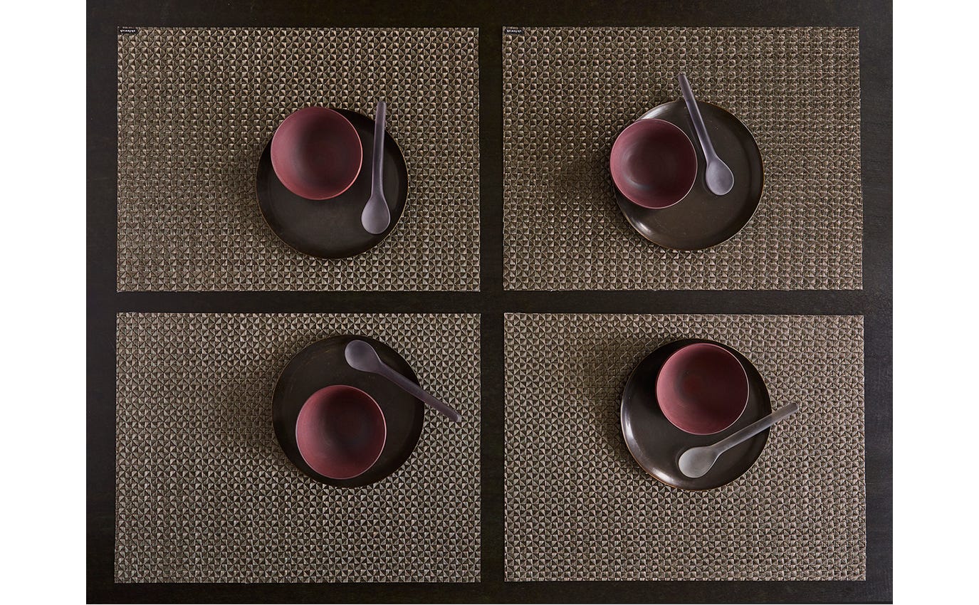 The Chilewich Origami placemat (14" x 19") blends texture and pattern in a striking crepe weave, revealing geometric details that create a softly shimmering, multifaceted surface. Designed for both indoor and outdoor use, it’s as practical as it is beautiful—simply wipe clean with soap and water, or use a soft brush with a bleach-based cleanser for stubborn stains.